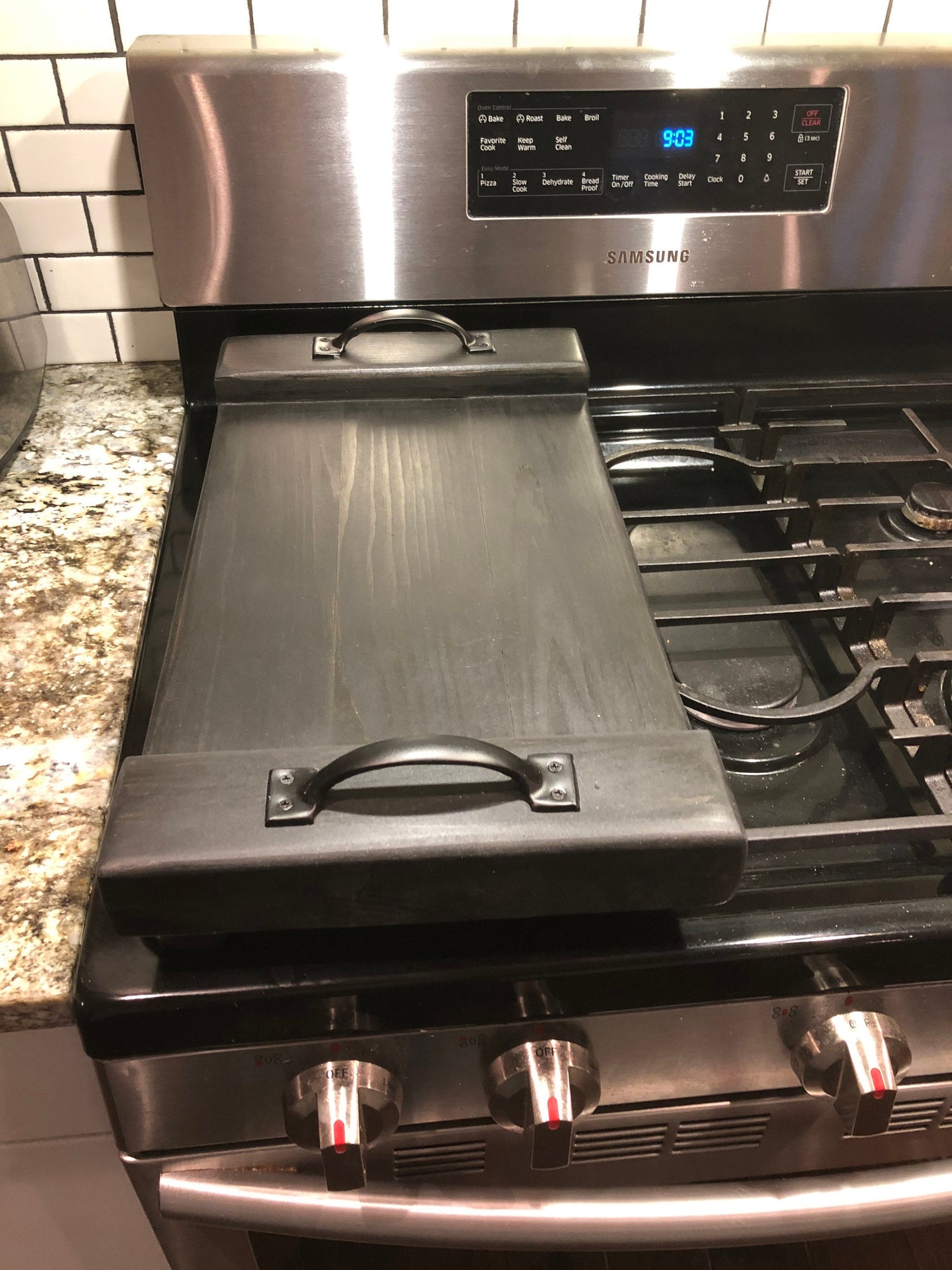 This tray is for decor purposes only, do not use on a hot stove. Always allow your stove to cool before placing on top. Please note that these products are not intended to be used as a cutting board; they are not food-grade safe and as such should be used for no other purpose than storage / decoration.